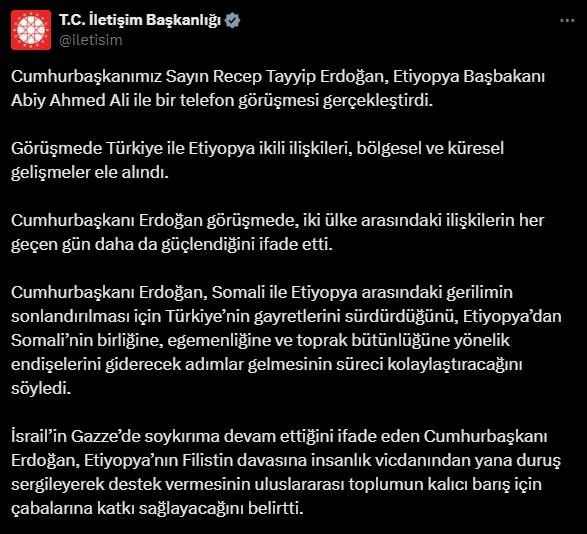 Başkan Recep Tayyip Erdoğan, Etiyopya Başbakanı Abiy Ahmed Ali ile telefonda görüştü. Başkan Erdoğan görüşmede, Somali ile Etiyopya arasındaki gerilimin sonlandırılması için Türkiye'nin gayretlerini sürdürdüğünü, Etiyopya'dan Somali'nin birliğine, egemenliğine ve toprak bütünlüğüne yönelik endişelerini giderecek adımlar gelmesinin süreci kolaylaştıracağını söyledi.