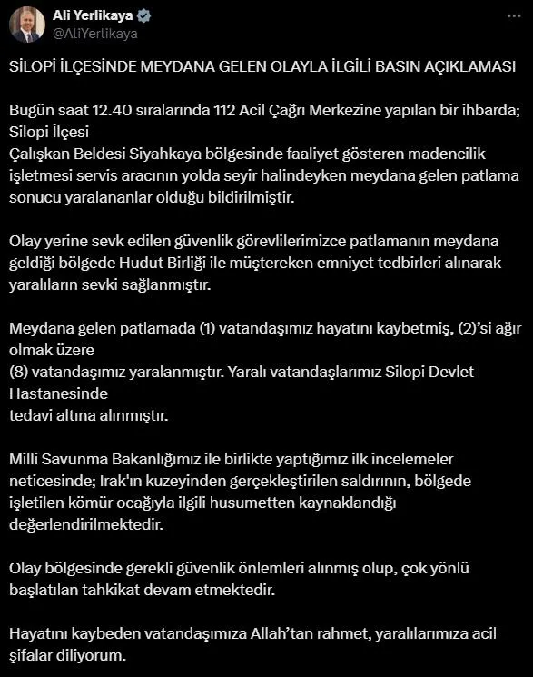 İçişleri Bakanı Ali Yerlikaya, Silopi'de seyir halindeyken meydana gelen patlamayla ilgili sosyal medya hesabından açıklamalarda bulundu.