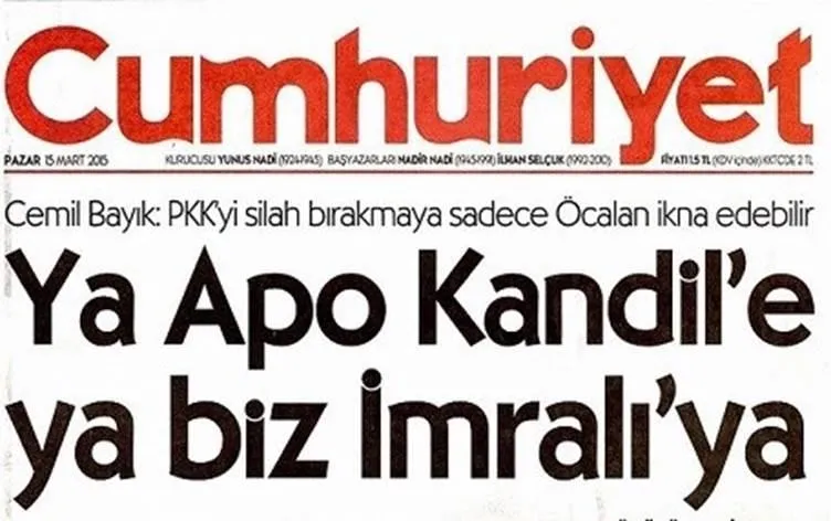 Çözüm süreci döneminde Kandil'e giderek KCK Eşbaşkanı Cemil Bayık'la utanmadan görüşen Cumhuriyet gazetesi, tescilli terörist Bayık'ın açıklamalarını "Ya Apo Kandil'e ya biz İmralı'ya" sözleriyle manşetten vermişti. Manşet değeri görülen haberde şu ifadeler yer alıyordu: "Sürecin ilerlemesi ve PKK'nın silah bırakması için Öcalan ile görüşmelerin sağlanması gerektiğini söyleyen Bayık, istenirse kendilerinin İmralı'ya götürülebileceğini belirtti. Bayık, 'Fakat bizim istediğimiz Apo'nun özgürleşmesidir. Bu gecikmiş bir taleptir' dedi.