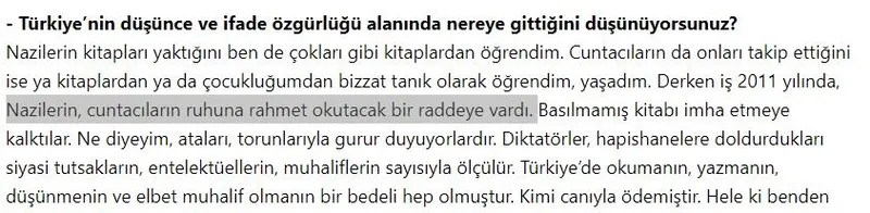 Silivri Cezaevi'nde tutuklu yargılandığı 2023'te Ahmet Şık, yasaklanan kitabı ile ilgili Cumhuriyet gazetesinden Meltem Yılmaz'ın Türkiye'nin düşünce ve ifade özgürlüğü konulu sorusuna Türkiye hakkında ''Nazilerin ruhuna rahmet okutacak bir raddede'' demişti.