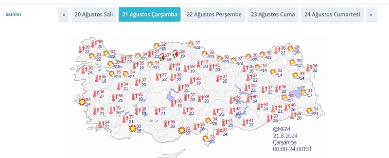 MGM’den yapılan son tahminlere göre, Ağustos ayının en sıcak haftasına giriyoruz. Yurt genelinde hava sıcaklıklarının mevsim normallerinin üzerinde olacağını duyuran MGM, haftanın en sıcak günü de açıkladı. Peki bugün hava nasıl olacak? İşte il il hava durumu