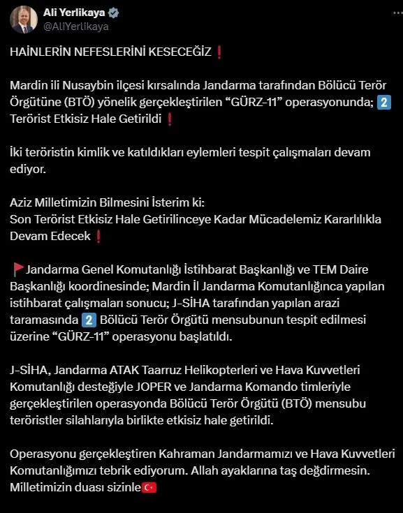 İçişleri Bakanı Ali Yerlikaya, Mardin'in Nusaybin ilçesi kırsalında jandarma tarafından bölücü terör örgütüne yönelik "Gürz-11" operasyonunda, 2 teröristin etkisiz hale getirildiğini bildirdi.