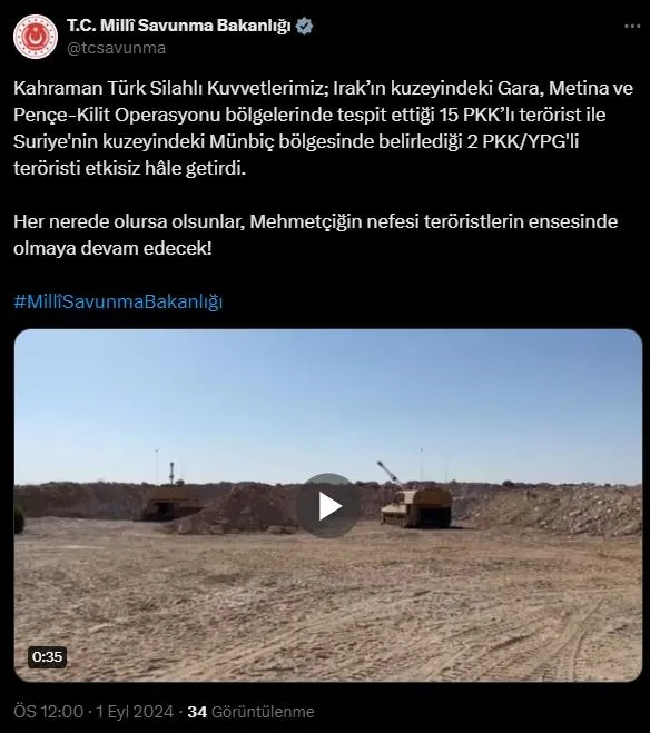 "Kahraman Türk Silahlı Kuvvetlerimiz, Irak'ın kuzeyindeki Gara, Metina ve Pençe-Kilit Operasyonu bölgelerinde tespit ettiği 15 PKK'lı terörist ile Suriye'nin kuzeyindeki Münbiç bölgesinde belirlediği 2 PKK/YPG'li teröristi etkisiz hale getirdi.