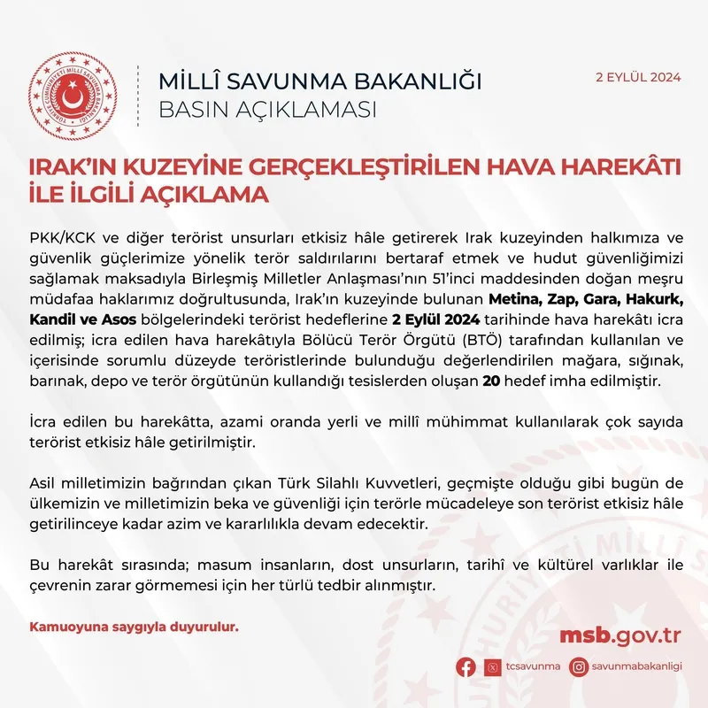 Milli Savunma Bakanlığı sosyal medya hesabından yaptığı paylaşımda, "PKK/KCK ve diğer terörist unsurları etkisiz hâle getirerek Irak kuzeyinden halkımıza ve güvenlik güçlerimize yönelik terör saldırılarını bertaraf etmek ve hudut güvenliğimizi sağlamak maksadıyla Birleşmiş Milletler Anlaşması'nın 51'inci maddesinden doğan meşru müdafaa haklarımız doğrultusunda, Irak'ın kuzeyinde bulunan Metina, Zap, Gara, Hakurk, Kandil ve Asos bölgelerindeki terörist hedeflerine 2 Eylül 2024 tarihinde hava harekâtı icra edilmiş; icra edilen hava harekâtıyla Bölücü Terör Örgütü (BTÖ) tarafından kullanılan ve içerisinde sorumlu düzeyde teröristlerinde bulunduğu değerlendirilen mağara, sığınak, barınak, depo ve terör örgütünün kullandığı tesislerden oluşan 20 hedef imha edilmiştir. İcra edilen bu harekâtta, azami oranda yerli ve milli mühimmat kullanılarak çok sayıda terörist etkisiz hale getirilmiştir.