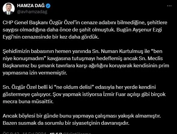 CHP Genel Başkanı Özgür Özel, İsrail tarafından şehit edilen Ayşenur Ezgi Eygi'nin cenazesinde TBMM Başkanı Numan Kurtulmuş ile miktofon polemiğine girdi. TBMM Başkanı Kurtulmuş, 'burası yeri değil.' ifadeleriyle Özgür Özel'i uyarmaya çalışsa da, Özel tartışmaya devam etti. Özel'in saygısızlığına AK Parti Genel Başkan Yardımcısı Hamza Dağ sosyal medya hesabından tepki göstererek, ders niteliğinde cevap verdi.