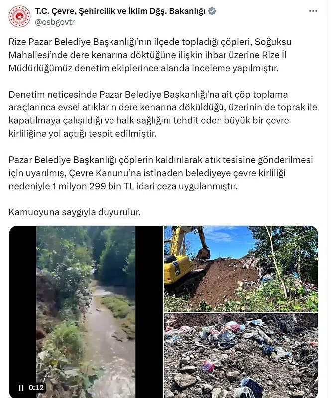 Bakanlığın sosyal medya hesabından yapılan açıklamada, "Denetim neticesinde Pazar Belediye Başkanlığı'na ait çöp toplama araçlarınca evsel atıkların dere kenarına döküldüğü, üzerinin de toprak ile kapatılmaya çalışıldığı ve halk sağlığını tehdit eden büyük bir çevre kirliliğine yol açtığı tespit edilmiştir. ."Pazar Belediye Başkanlığı çöplerin kaldırılarak atık tesisine gönderilmesi için uyarılmış, Çevre Kanunu'na istinaden belediyeye çevre kirliliği nedeniyle 1 milyon 299 bin TL idari ceza uygulanmıştır. Kamuoyuna saygıyla duyurulur" ifadeleri kullanıldı.