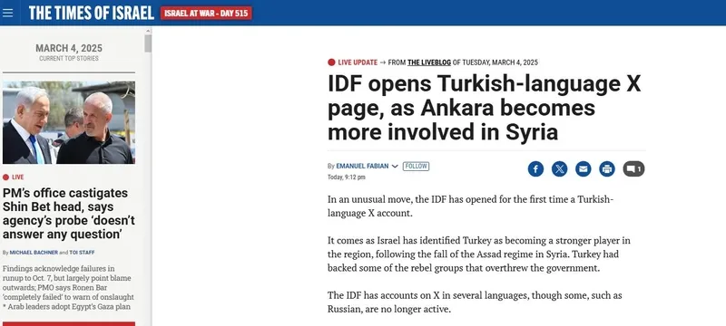 Tel Aviv basını İsrail'in bu adımı Türkiye'nin bölgede oyun kurucu konumuna gelmesi sonrası attığını itiraf etti. Okuyucularına, "Ankara Suriye'ye daha fazla dahil olurken IDF Türkçe X sayfası açtı" başlığıyla duyuran The Times Of İsrael gazetesi, haberinde, "Bu, İsrail'in Suriye'deki Esad rejiminin düşmesinin ardından Türkiye'nin bölgede daha güçlü bir oyuncu haline geldiğini tespit etmesiyle birlikte geldi. Türkiye, hükümeti deviren isyancı gruplardan bazılarını desteklemişti." ifadelerini kullandı.