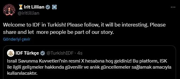 Gazze'ye ölüm yağdıran İsrail Savunma Kuvvetleri sosyal medya platformu X'te Türkçe hesap açtı. Paylaşılan videoda Ordu Sözcüsü Binbaşı Arye Shalicar konuşurken çıkan alt yazıda, Türkiye'nin T'sinin bilerek aşağılama amaçlı küçük yazıldığı dikkatlerden kaçmadı. Tel Aviv basını İsrail'in bu adımı Türkiye'nin bölgede oyun kurucu konumuna gelmesi sonrası attığını itiraf ederken Türk kullanıcılar hesaba tepki gösterdi.