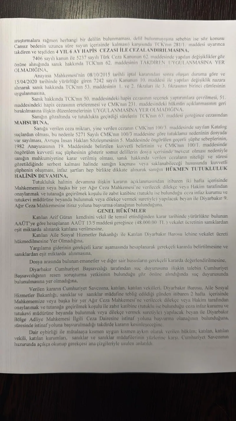 Heyet, kararın tebliğ edildiği günden itibaren 2 hafta içerisinde Diyarbakır Bölge Adliye Mahkemesi ilgili ceza dairesine istinaf yoluna başvurma olanağının bulunduğuna, süresinde istinaf yoluna başvurulmadığı takdirde kararın kesinleşeceğine oy birliğiyle hükmetti.