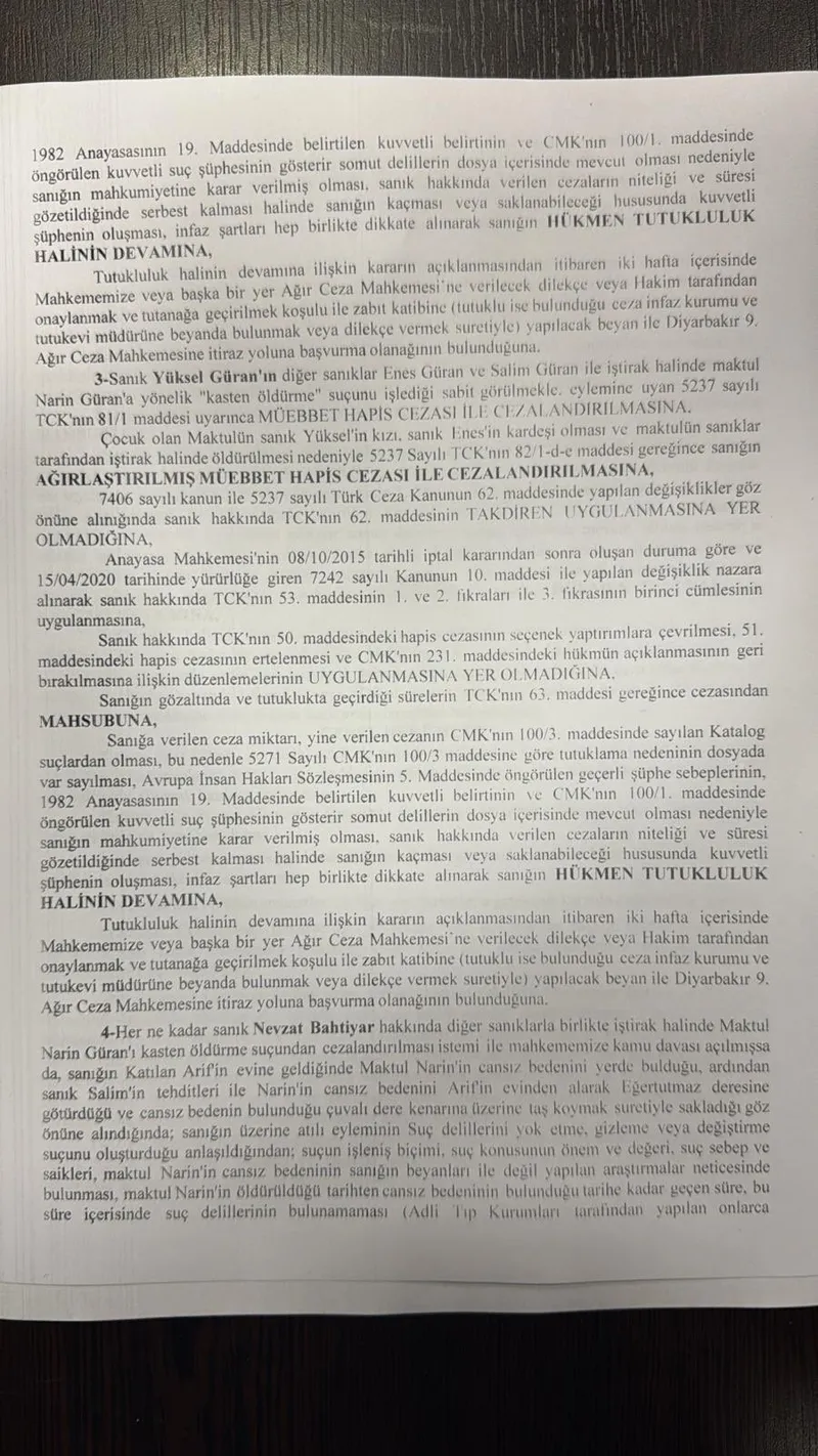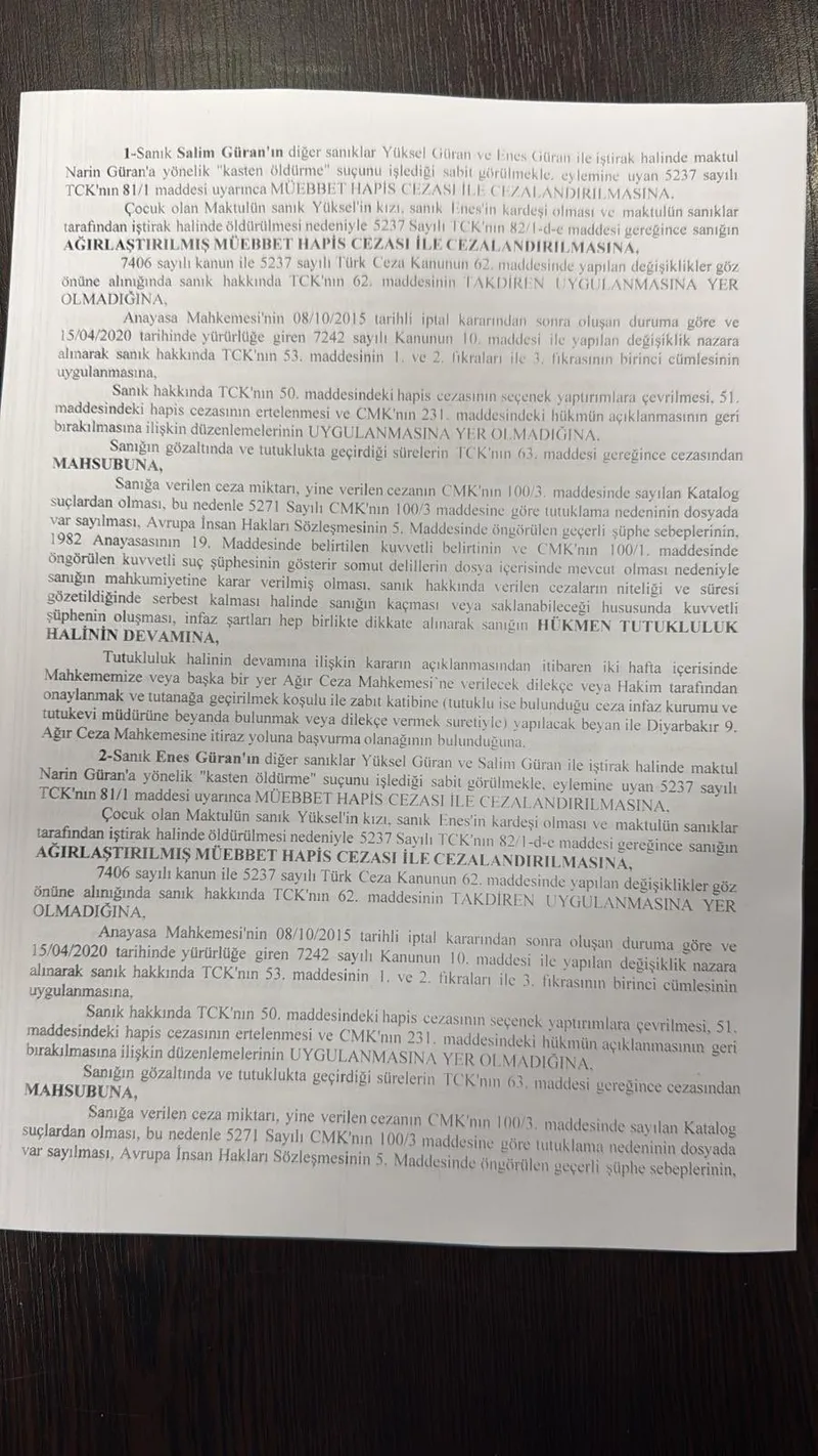 1982 Anayasasının 19. Maddesinde belirtilen kuvvetli belirtinin ve CMK'ın 1001 maddesinde öngörülen kuvvetli suç şüphesinin gösterir somut delillerin dosya içeresinde mevcut olması nedeniyle sanığın mahkumiyetine karar verilmiş olması, sanık hakkında verilen cezaların niteliği ve süresi gözetildiğinde serbest kalması halinde sanığın kaçması veya saklanabileceği hususunda kuvvetli şüphenin oluşması, infaz şartları hep birlikte dikkate alınarak sanığım HÜKMEN TUTUKLULUK HALİNİN DEVAMINA, Tutukluluk halinin devamına ilişkin kararın açıklanmasından itibareniki hafta içerisinde Mahkememize veya başka bir yer Ağır Ceza Mahkemesine verilecek dilekçe veya Hakim tarafından onaylanmak ve tutanağa geçirilmek koşulu ile zabit katibine (tutuklu le bulunduğu ceza infaz kurumu ve tutukevi müdürüne beyanda bulunmak veya dilekçe vermek suretiyle yapılacak bey an ile Diyarbakır 9. Ağır Ceza Mahkemesine itiraz yoluna başvurma olanağının bulunduğuna 3-Sanık Yüksel Güran'ın diğer sanıklar Enes Güran ve Salim Güran ile iştirak halinde maktul Narin Gürar'a yönelik "kasten öldürme suçunu işlediği sabit görülmekle, eylemine uyan 5237 saylı TCK'nın 81/1 maddesi uyarınca MÜEBBET HAPIS CEZASI İLE CEZALANDIRILMASINA çocuk olan maktul salim Yüksel'in kızı, sanık Enes'in kardeşi olması ve maktulün sanıklar tarafından iştirak halinde öldürülmesi nedeniyle 5237 Sayılı TCK’nın 82/1-d-e maddesi gereğince sanığın AĞIRLAŞTIRILMIŞ MÜEBBET HAPİS CEZASI İLE CEZALANDIRILMASINA 7406 sayılı kanun ile 5237 sayılı Türk Ceza Kanunun 62. maddesi yapılan değişiklikler göz önüne alınğında sanık hakkında TCK'nın 62. maddesinin TAKDİREN UYGULANMASINA YER OLMADIĞINA Anayasa Mahkemesinin 08/10/2015 tarihli iptal kararından sonra oluşan duruma göre ve 15/04/2020 tarihinde yürürlüğe giren 7242 sayılı Kanunun 10. maddesi de yapılan değişiklik nazara alınarak sanık hakkında TCK'nın 53, maddesinin 1. ve 2 fıkraları ile 3 fıkrasının birinci cümlesinin uygulanmasına, Sanık hakkında TCK'nın 50. maddesindeki hapis cezasının seçenek yaptırımlara çevrilmesi, 51. maddesindeki hapis cezasının ertelenmesi ve CMK'nın 231. maddesindeki hükmün açıklanmasının geri bırakılmasına ilişkin düzenlemelerinin UYGULANMASINA YER OLMADIĞINA, Sanığın gözaltında ve tutuklukta geçirdiği sürelerin TCK'nın 63. maddesi gereğince cezasından MAHSUBUNA. Sanığa verilen ceza miktarı, yine verilen cezanın CMK'nın 100/1, maddesinde sayıdan Katalog suçlardan olması, bu nedenle 5271 Sayılı CMK'mın 100/3 maddesine göre tutuklama nedeninin dosyada var sayılması, Avrupa İnsan Hakları Sözleşmesinin 5. Maddesinde öngörülen geçerli şüphe sebeplerinin, 1982 Anayasasının 19. Maddesinde belirtilen kuvvetli belirtinin ve CMK'nın 100/1, maddesinde Öngörülen kuvvetli suç şüphesinin gösterir somut delillerin doya içerisinde mevcut olması nedeniyle sanığın mahkumiyetine karar verilmiş olması, sanık hakkında verilen cezaların niteliği ve süresi gözetildiğinde serbest kalması halinde sanığın kaçırması veya saklanabileceği hususunda kuvvetli şüphenin oluşması, infaz şartları hep birlikte dikkate alınarak sanığın HÜKMEN TUTUKLULUK HALİNİN DEVAMINA, Tutukluluk halinin devamına ilişkin kararın açıklanmasından itibaren iki hafta içerisinde Mahkememize veya başka bir yer Ağır Ceza Mahkemesi'ne verilecek dilekçe veya Hakim tarafından onaylanmak ve tutanağa geçirilmek koşulu ile zabıt katibine (tutuklu ise bulunduğu ceza infaz kuruma ve tutukevi müdürüne beyanda bulunmak veya dilekçe vermek suretiyle yapılacak beyan ile Diyarbakır 9. Ağır Ceza Mahkemesine itiraz yoluna başvurma olanağının bulunduğuna