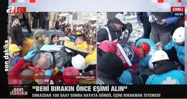 Hatay'da 108. saatte 2 mucize birden yaşandı. Enkazdan 108 sonra hayata dönen bir depremzedenin ilk sözleri, "Beni bırakın eşimi alın" oldu. Yaklaşık 5 dakika sonra yaşlı adamın eşi de enkaz altından çıkarıldı.