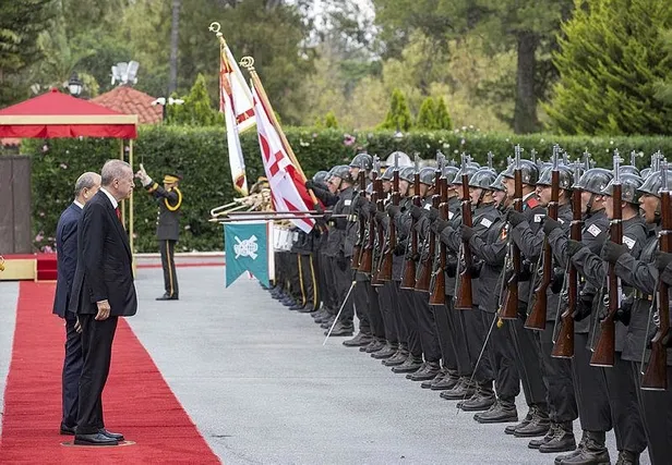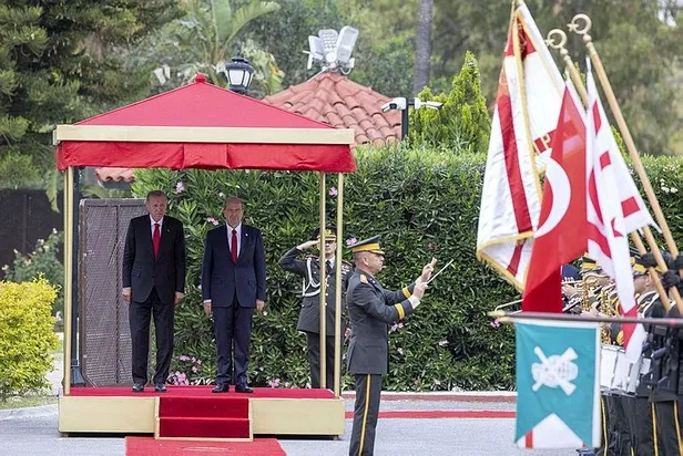 Başkan Recep Tayyip Erdoğan, Kuzey Kıbrıs Türk Cumhuriyeti Cumhurbaşkanı Ersin Tatar tarafından resmi törenle karşılandı.