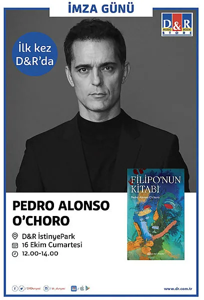 Dünyada büyük hayran kitlesi oluşturan 'La Casa De Papel' dizisindeki ‘Berlin’ karakterine rol veren ünlü İspanyol oyuncu Pedro Alonso O’choro, kaleme aldığı yeni kitabı için Türkiye’ye geldi. "Filipo'nun Kitabı" eserine imza atan İspanyol dizi, sinema ve tiyatro oyuncusu Pedro Alonso, CVK Park Bosphorus Hotel'de düzenlenen basın toplantısında, yeni eserinin yanı sıra yazarlık ve oyunculuk kariyerine ilişkin bilgi verdi. D&R Kitap Fuarı’nın özel konuğu O’choro, 16 Ekim Cumartesi günü D&R İstinyePark’ta, 17 Ekim Pazar günü D&R Akasya’da yeni kitabını imzalayacak. İmza etkinlikleri, 12.00-14.00 saatleri arasında gerçekleşecek.