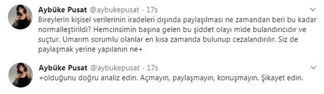 "Bireylerin kişisel verilerinin iradeleri dışında paylaşılması ne zamandan beri bu kadar normalleştirildi? Hemcinsimin başına gelen bu şiddet olayı mide bulandırıcıdır ve suçtur. Umarım sorumlu olanlar en kısa zamanda bulunup cezalandırılır. Siz de paylaşmak yerine yapılanın ne olduğunu doğru analiz edin. Açmayın, paylaşmayın, konuşmayın. Şikayet edin."