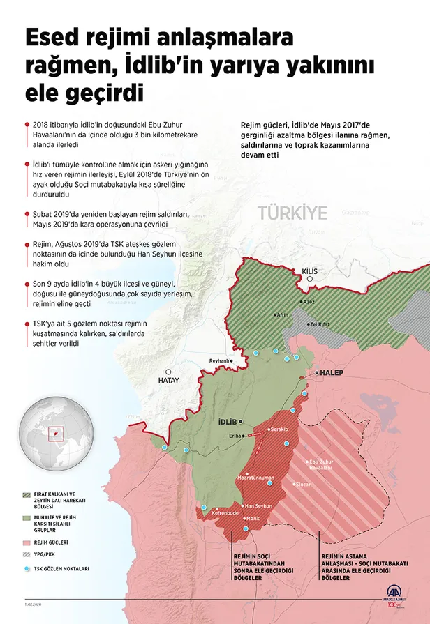 Rusya'dan hava desteği alan Beşşar Esad rejimi ve İran destekli yabancı terörist gruplar, Astana anlaşmaları ve Soçi mutabakatını hiçe sayarak İdlib Gerginliği Azaltma Bölgesi'nde 2 günde 10 yerleşimi daha ele geçirdi.