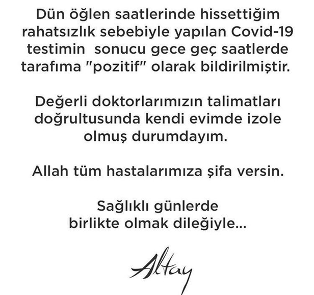 Sosyal medya hesabından açıklama yapan 50 yaşındaki sanatçı, "Dün öğlen saatlerinde hissettiğim rahatsızlık sebebiyle yapılan Covid-19 testimin sonucu gece geç saatlerde tarafıma 'pozitif' olarak bildirilmiştir. Değerli doktorlarımızın talimatları doğrultusunda kendi evimde izole olmuş durumdayım. Allah tüm hastalarımıza şifa versin" ifadelerini kullandı.