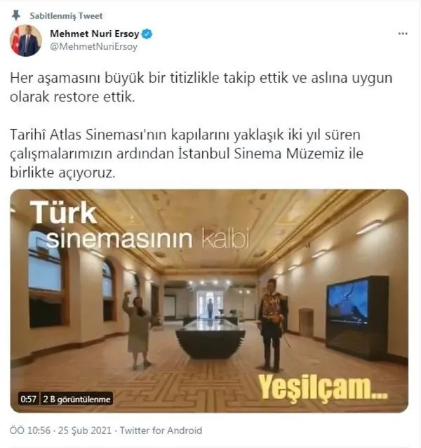 İçinde sinemamızın zengin tarihini yansıtan müzenin de bulunduğu Atlas Sineması'nın yeniden açılacak olması sanatımız adına çok sevindirici.