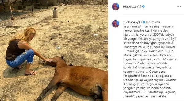 Dün öğle saatlerinde Manavgat'ın Yeniköy mahallesinde başlayan ve büyüyerek 4 farklı noktada gün boyu ilerleyen yangında eski manken Tuğba Özay'ın çiftliği de zarar gördü.
