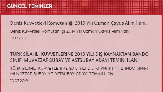 10 Temmuz 2019 tarihinde Türk Silahlı Kuvvetleri Kara, Deniz ve Hava Kuvvetleri Komutanlığına dış kaynaktan Bando sınıfı Muvazzaf Subay ve Muvazzaf Astsubay alım ilanı yayımlandı. Bu ilana Ön Lisans ve Lisans mezunu olan adaylar başvuru yapabilecekler. Bir sonraki ilan ise 11 Temmuz 2019 tarihinde geldi ve Deniz Kuvvetleri Komutanlığı 2019 yılı Uzman çavuş alımı için ilan yayımladı ve en az lise mezunu olan adayların başvuru yapabileceğini belirtti.