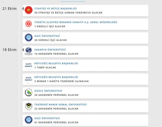 Eylül ayı itibari ile yayımlanmış olan ilanlara bakıldığında başvuruları Ekim ayında başlayacak olan kamu kurmları, Farklı Üniversiteler, Milli Savunma Bakanlığı, Kültür Bakanlığı, Adalet Bakanlığı, Tarım Kredi Kooperatifleri, TÜBİTAK, Sermaye Piyasası Kurulu, Sahil Güvenlik Komutanlığı, Nükleer Düzenleme Kurumu, İş Bankası, Ceza ve Tevkiefevleri Genel Müdürlüğü, Kamu Göretimi Kurumu, TMSF, Dışişleri Bakanlığı gibi kamu kurumları veya kuruluşları alım yapıyorlar.