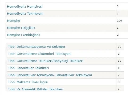 İŞKUR üzerinden yayınlanan duyurularda en az ilkokul mezunu olmak şartı ile hastanelere personel alımı yapılacağı açıklandı. ATT, Anestezi teknikeri, ambulans şoförü, hemşire, sekreter, hasta danışmanı, yaşlı bakımı elemanı, temizlik personeli, klinik destek elemanı, hasta kayıt kabul görevlisi kadrolarına yapılan personel alımlarında başvuru bilgileri aşağıda bulunmakta