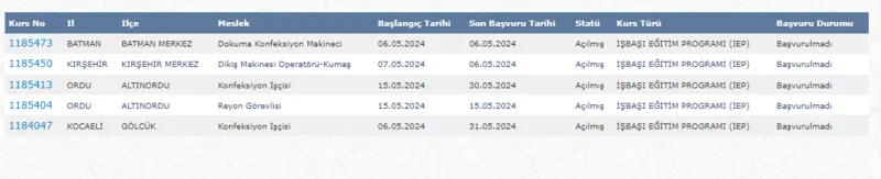 Farklı illerde ve mesleklerde açılmış olan işbaşı eğitim programlarından bazı örnekler aşağıda verilmiştir: