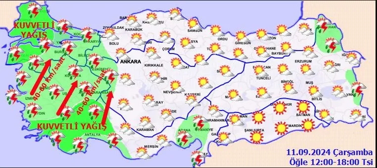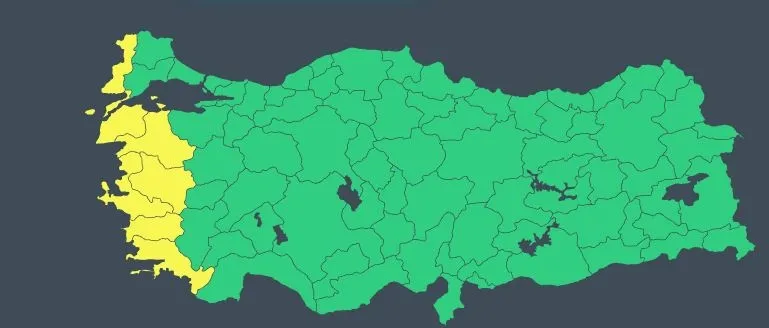 Eylül ayının başlarından itibaren etkisini gösteren serin hava bu hafta da devam edecek. Meteoroloji Genel Müdürlüğü, yayınladığı yeni hava durumu haritasında 7 ile sarı kodlu uyarıda bulundu. Yağışların özellikle iki ilde çok kuvvetli olması beklendiğinden yaşanabilecek, ani sel, su baskını, yıldırım, yerel dolu yağışı ve yağış anında kuvvetli rüzgâr gibi olumsuzluklara karşı dikkatli tedbirli olunması gerektiğini duyurdu.