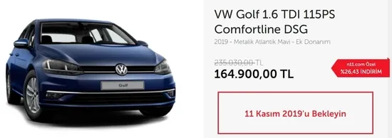 n11.com online alışveriş platformu, 11 Kasım tarihinde satışa sunulan Volkswagen marka otomobillere yüzde 26 oranında indirim sunuyor. n11 araba kampanyası kapsamında bir kişi yalnızca bir otomobil satın alabiliyor. Volkswagen Tiguan, Passat, Polo ve Golf otomobiller sadece 11 Kasım 2019 tarihinde n11.com web sitesinde ve mobil uygulamasında satışta olacaktır. n11.com indirim kampanyası gereği müşterilere uygun fiyatlara alışveriş yapma imkanı sunmuştur. Bu uygulama kapsamında kendi sitesinde indirim kuponları görünmektedir. İndirim kuponlarını kampanya gününden önce farklı uygulamalar ile vermiştir. Şimdi de yapılan alışverişin ardından kupon veriyor.