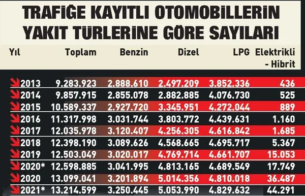 Söz konusu ayda trafiğe kaydı yapılan otomobillerin içinde elektrikli veya hibrit araç oranının (yüzde 9.1) ilk kez LPG yakıtlı otomobil oranını (yüzde 4.9) geçmesi dikkati çekti. Şubatta, 3 bin 885 elektrikli veya hibrit, 2 bin 79 LPG yakıtlı otomobil trafiğe kaydedildi.