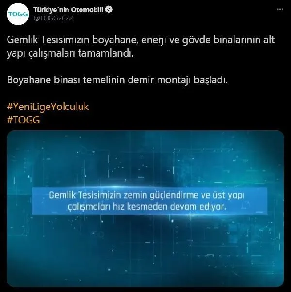 TOGG'un sosyal medya hesabından yaptığı paylaşımda; boyahane, enerji, gövde ve giriş binalarının alt yapı çalışmalarının tamamlandığı, boyahane binası temelinin demir montajının başladığı duyuruldu.