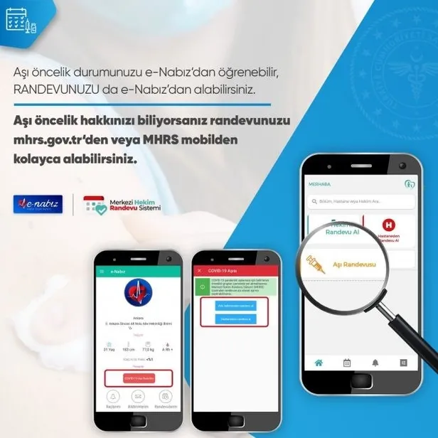 Aşı için randevular Sağlık Bakanlığının Merkezi Hekim Randevu Sistemi'nin web sayfası https://www.mhrs.gov.tr ile MHRS Mobil veya e-Nabız uygulamalarından alınabiliyor.