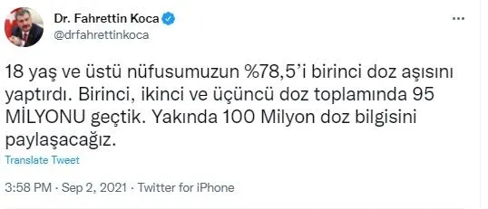 Bakan Koca, konuya ilişkin "18 yaş ve üstü nüfusumuzun %78,5'i birinci doz aşısını yaptırdı. Birinci, ikinci ve üçüncü doz toplamında 95 milyonu geçtik. Yakında 100 Milyon doz bilgisini paylaşacağız." dedi.