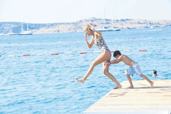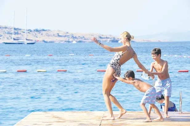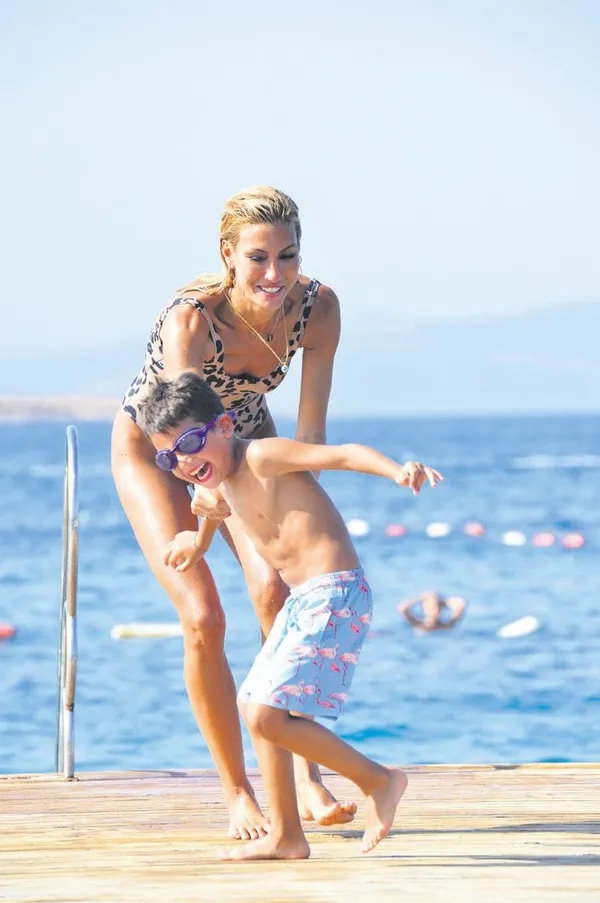 Daha sonra deniz keyfi yapmak için iskeleye giden anne ile oğullarının eğlenceli halleri tatilcileri imrendirdi.