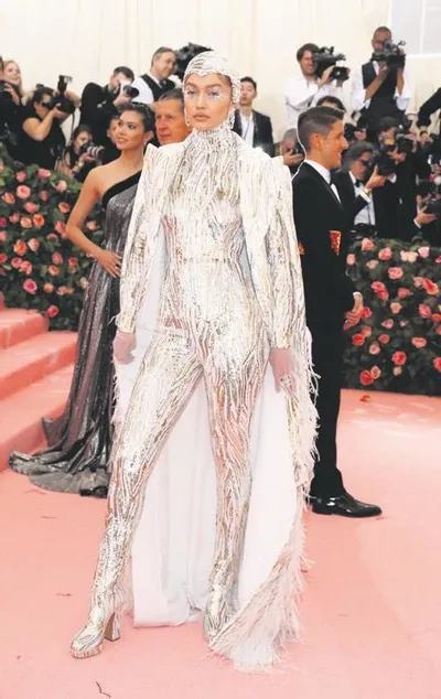 Filistin asıllı model Gigi Hadid, kostümünü tüylü bir pelerinle tamamladı. Süpermodelin ilginç kirpik modeli de dikkatlerden kaçmadı.