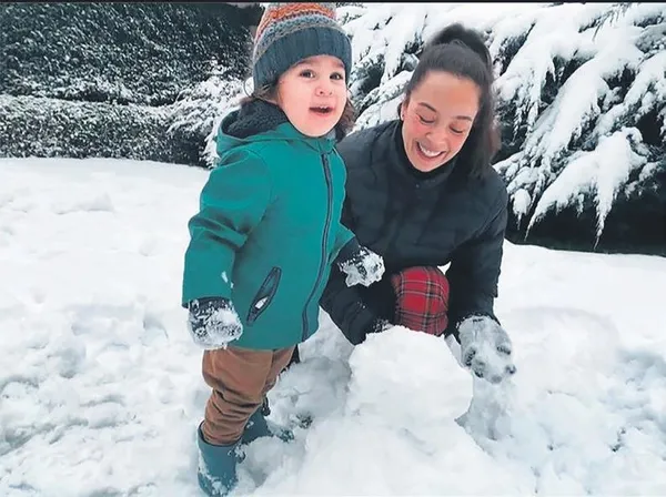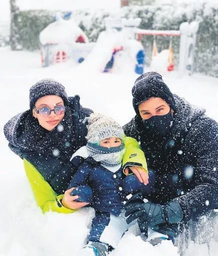 Tolgahan Sayışman ve Almeda Abazi, oğulları Efehan'la bahçelerinde kar keyfi yaptı.