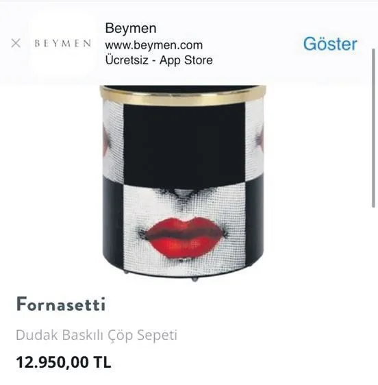 Beymen, internet sitesinde çöp sepeti sattı! Fornasetti marka "dudak baskılı" sepetin fiyatı dudak uçuklattı. Çünkü çöp atılması için tasarlanan sepetin fiyatı tam 12.950,00 liraydı. Tanıtımda yüzde 90'ının demir, yüzde 10'unun pirinç kaplama olduğu yazıldı. Hatta 2021 ilkbahar yaz kreasyonu olduğu vurgulandı. Kargo hizmetinin bedava olduğu aktarıldı. Firmanın diğer ürünlerinin fiyatı da çöp tenekesinden farksızdı. Ancak yaklaşık 13 bin TL'lik öpücük, sosyal medyayı da salladı.