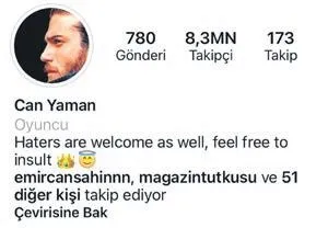 Instagram hesabında 8.3 milyon kişinin takip ettiği Can Yaman, sosyal medyada yapılan nefret dolu söylemler karşısında daha fazla sessiz kalamadı. Ünlü oyuncu, tepkisini yine Instagram'da gösterdi. Profiline İngilizce olarak "Nefret edenler de hoş karşılanır, hakaret etmekten çekinmeyin" notu düşen Can Yaman, böylece herkese de kibar bir dille dersini verdi.