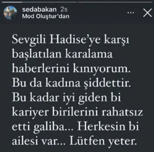Oyuncu Seda Bakan yaşanan olaylar sonrası sosyal medya hesabından Hadise'ye destek mesajı yayınlayan nadir insanlardan oldu. Bakan mesajıyla kara gün dostu olduğunu gösterdi.