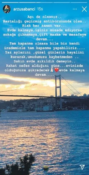 Sosyetik Arzu Sabancı, muhteşem yalısında sıkıldı. Boğaz manzarasına daldı. Pandemi günlerini evde geçiren milyonlara "Sakın evde sıkıldık demeyin" çağrısı yaptı. Takipçileri "O yalıda biraz da biz sıkılsak" yorumunda bulundu.