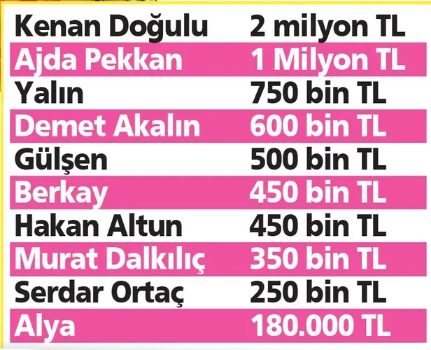 Tabii daha bitmedi. Alya, 180 bin TL alırken, Berkay 450 bin TL, Yalın 750 bin TL, Gülşen 500 bin TL, Demet Akalın 600 bin TL, Hakan Altun 450 bin TL sahne ücreti almaya başlamış. Bunlara ek olarak Süperstar Ajda Pekkan 1 milyon TLtalep ederken Kenan Doğulu ise kaşesini 150 bin dolara çıkartmış .