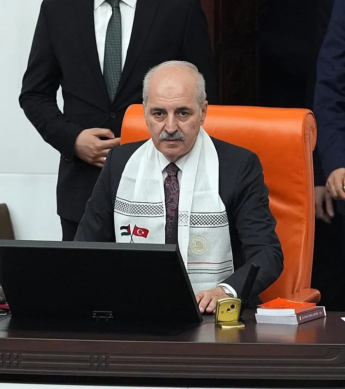 TBMM Başkanı Kurtulmuş ile Divan üyelerinin, oturumda Türk ve Filistin bayraklarının yer aldığı atkı taktığı görüldü.