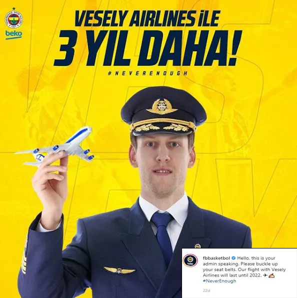 Fenerbahçe Basketbol, resmi Instagram hesabından 'Vesely Havayolları' lakabına atıfta bulunarak eğlenceli bir paylaşımlar sözleşmeyi duyurdu. Paylaşımda 'Merhaba, kaptanınızı konuşuyor. Lütfen kemerlerinizi bağlayın. Vesely Havayolları ile uçuşumuz 2022'ye kadar devam edecektir.' denildi.