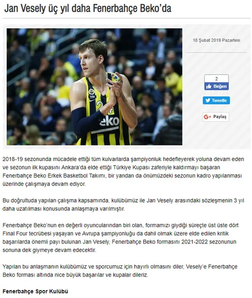 Yapılan bu anlaşmanın kulübümüz ve sporcumuz için hayırlı olmasını diler, Vesely'e Fenerbahçe Beko forması altında nice büyük başarılar ve kupalar dileriz."