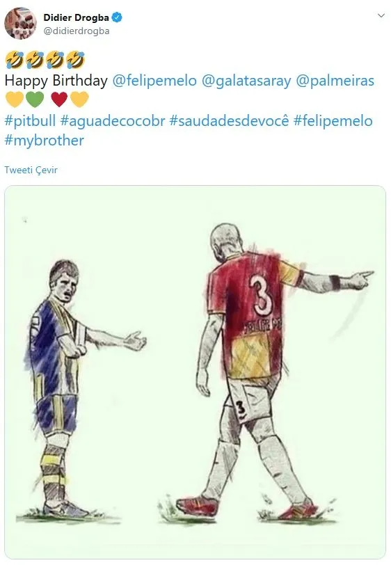 Galatasaray'ın eski yıldızı Didier Drogba, bir dönem birlikte top oynadığı Felipe Melo'nun doğum gününü Twitter'dan yaptığı paylaşımla kutladı. Dünyaca ünlü eski futbolcu Didier Drogba’nın yaptığı paylaşımdaki Emre Belözoğlu detayı dikkatlerden kaçmadı.