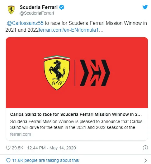 İtalyan takımıyla 2021 ve 2022 sezonları için anlaşma imzalayan Sainz, "Scuderia Ferrari adına yarışacak olmaktan dolayı çok mutluyum ve takımın geleceği adına heyecanlıyım. Bu sezon McLaren ile önemli bir süreçten geçiyoruz ve tekrar pistlere çıkmak için sabırsızlanıyorum." ifadelerini kullandı.