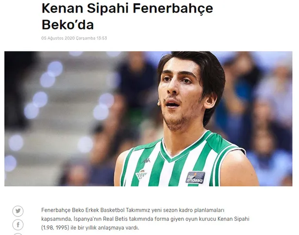 Fenerbahçe Beko yeni sezon kadro planlamaları kapsamında, İspanya'nın Real Betis takımında forma giyen oyun kurucu Kenan Sipahi (1.98, 1995) ile bir yıllık anlaşmaya vardı.