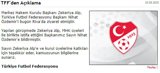 Türkiye Futbol Federasyonu (TFF), resmi internet sitesi üzerinden Merkez Hakem Kurulu (MHK) Başkanı Zekeriya Alp ve ekibinin istifa ettiğini duyurdu.