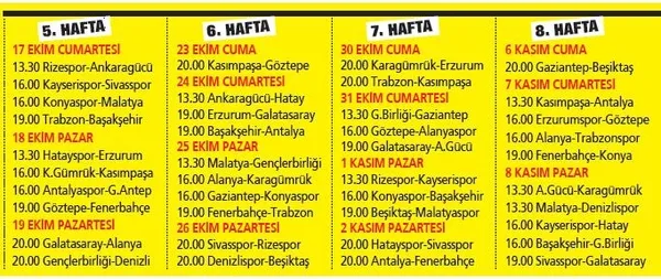 Süper Lig'de 4 haftalık maç programı açıklandı. Fenerbahçe ile Trabzonspor arasında 6. haftada oynanacak dev maçın tarihi 25 Ekim olarak belirlendi. 5. haftadaki kritik Galatasaray-Alanyaspor maçı ise 19 Ekim tarhinde oynanacak.