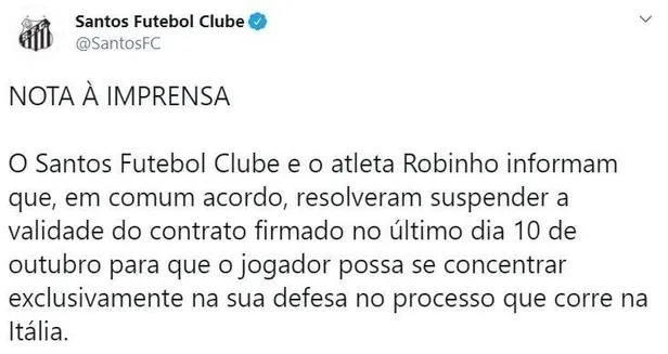 Santos Kulübü'nden yapılan açıklamada, "Robinho'nun İtalya'da süren davasının savunmasına yoğunlaşabilmesi için taraflar, karşılıklı anlaşarak 10 Ekim'de imzalanan sözleşmenin askıya alınmasına karar vermiştir." ifadesi kullanıldı.