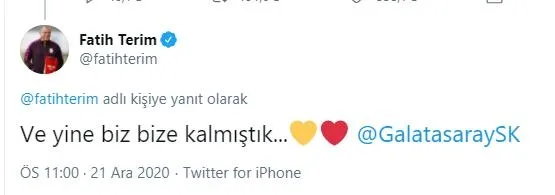 Fatih Terim, G.Saray'a geri döndüğü "Nerede kalmıştık?" paylaşımının 3. yıl dönümünde 'Ve yine biz bize kalmıştık' paylaşımını yaptı. Deneyimli hocanın paylaşımı beğeni rekoru kırdı.